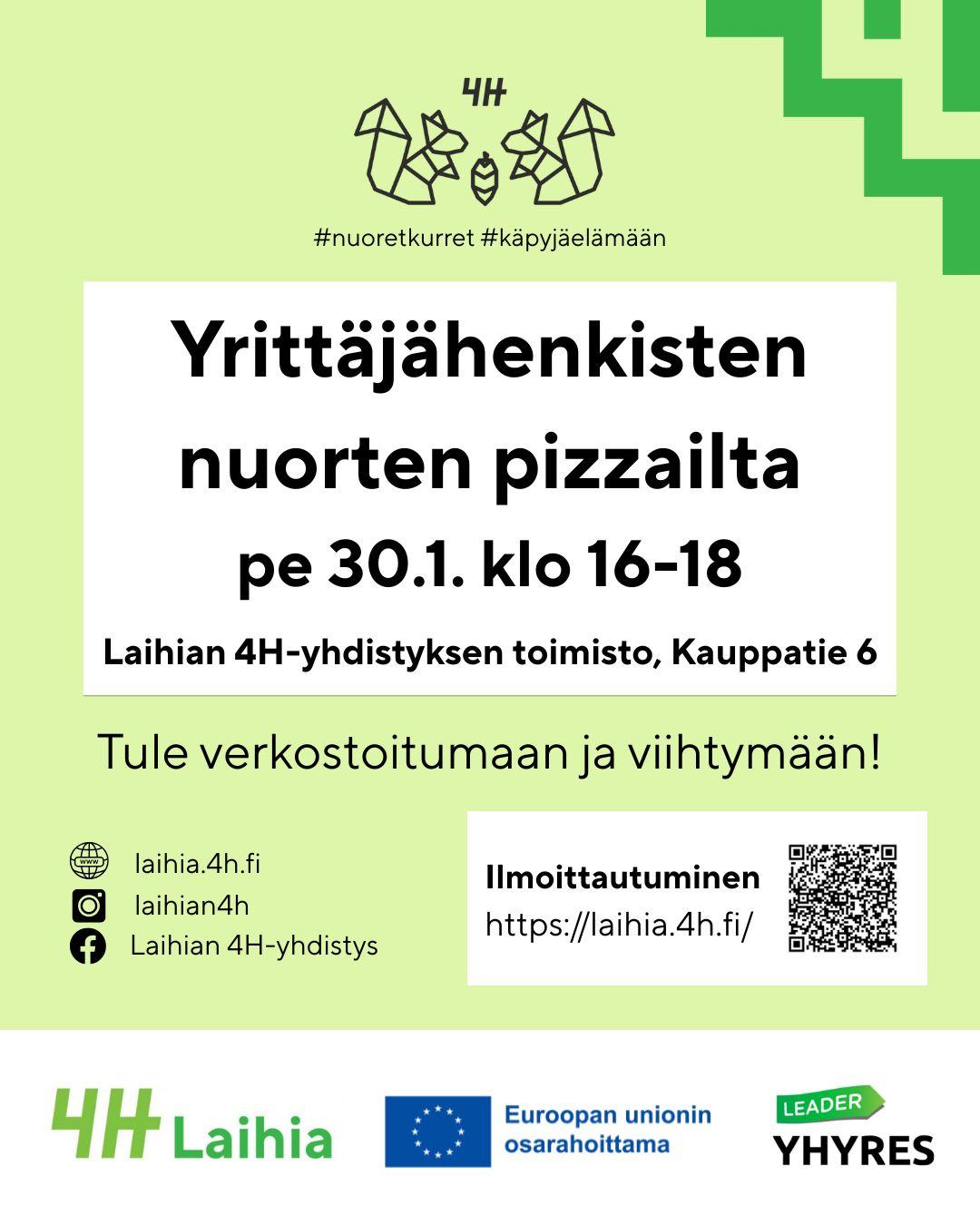 Illan aikana pääset tutustumaan muihin samanhenkisiin nuoriin sekä kuulemaan lisää 4H-yrittäjyydestä. Perjantain 30.1.2026 tapaamisessa pääsette ideoimaan tulevan kauden toimintaa ja osallistumaan virkistystoimintaan eli pizzan leivontaan!