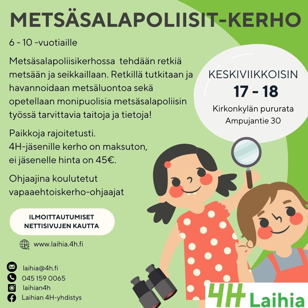 Kerhoon saa tulla tutustumaan maksutta. Sovithan asiasta ennalta yhdistyksen toiminnanjohtajan kanssa: laihia@4h.fi / 045 159 0065. Tervetuloa!
