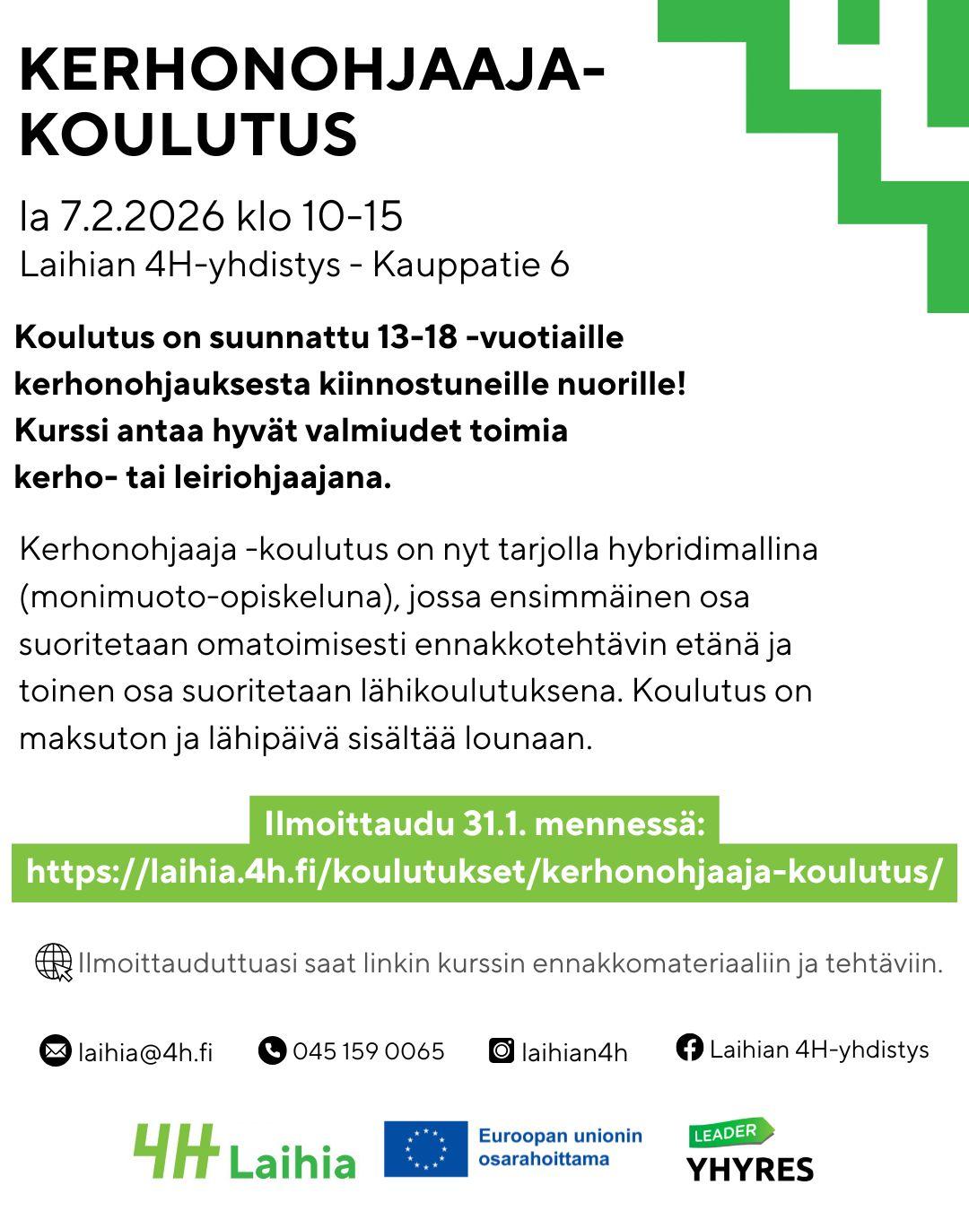 Lisää tietoa koulutuksesta saat Laihian 4H-yhdistyksestä Millalta; laihia@4h.fi / 0451590065.