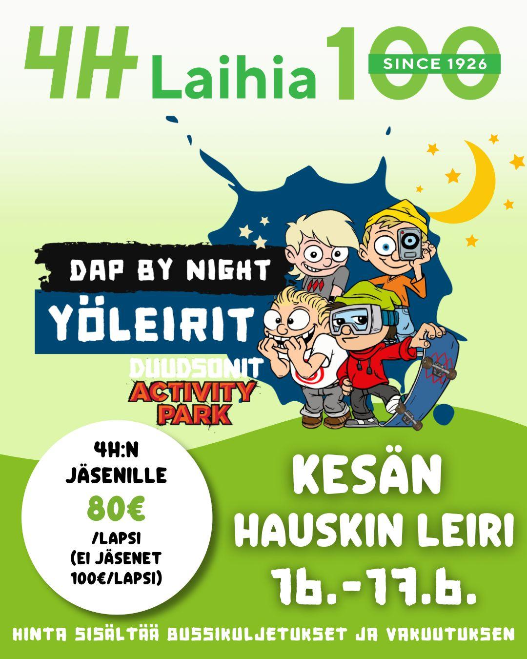Kuljetus Laihian 4H-yhdistyksen toimiston edestä (Kauppatie 6) ti 16.6. klo 17.30 ja paluu ke 18.6. noin klo 12.00.